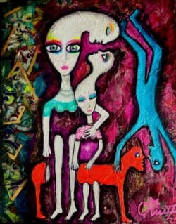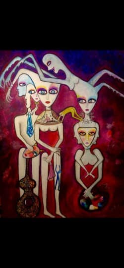 "L'obscurité restaure ce que la lumière ne peut réparer" technique mixte et acrylique, dimensions 18x26 cm , prix 500€. C'est une œuvre empreinte de mystère et de symbolisme. Le taureau rouge posé comme un masque sur la figure principale, incarne la force brute, les instincts ou un fardeau psychologique. Les poissons évoquent la mémoire, le silence et les blessures intérieures, tandis que la figure blanche mordant le flanc de la femme suggère une autodestruction ou un combat intérieur. Ce tableau interroge la facon dont les blessures profondes ne peuvent être réparés par la seule lumière et souligne l'importance du subconscient dans le processus de reconstruction intérieur.
