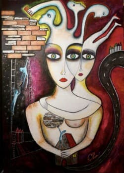 Carmen Ruiz détourne le violoncelle en un symbole de féminité entravée, ou l'instrument devient le corps même de la femme. L'archet remplacé par un couteau évoque la violence, l'autodestruction ou le combat intérieur. Le regard fixe et troublant des personnages renforce cette tension entre douceur musicale et douleur muette. Une œuvre poignante, qui questionne les dissonances entre corps, musique et souffrance.