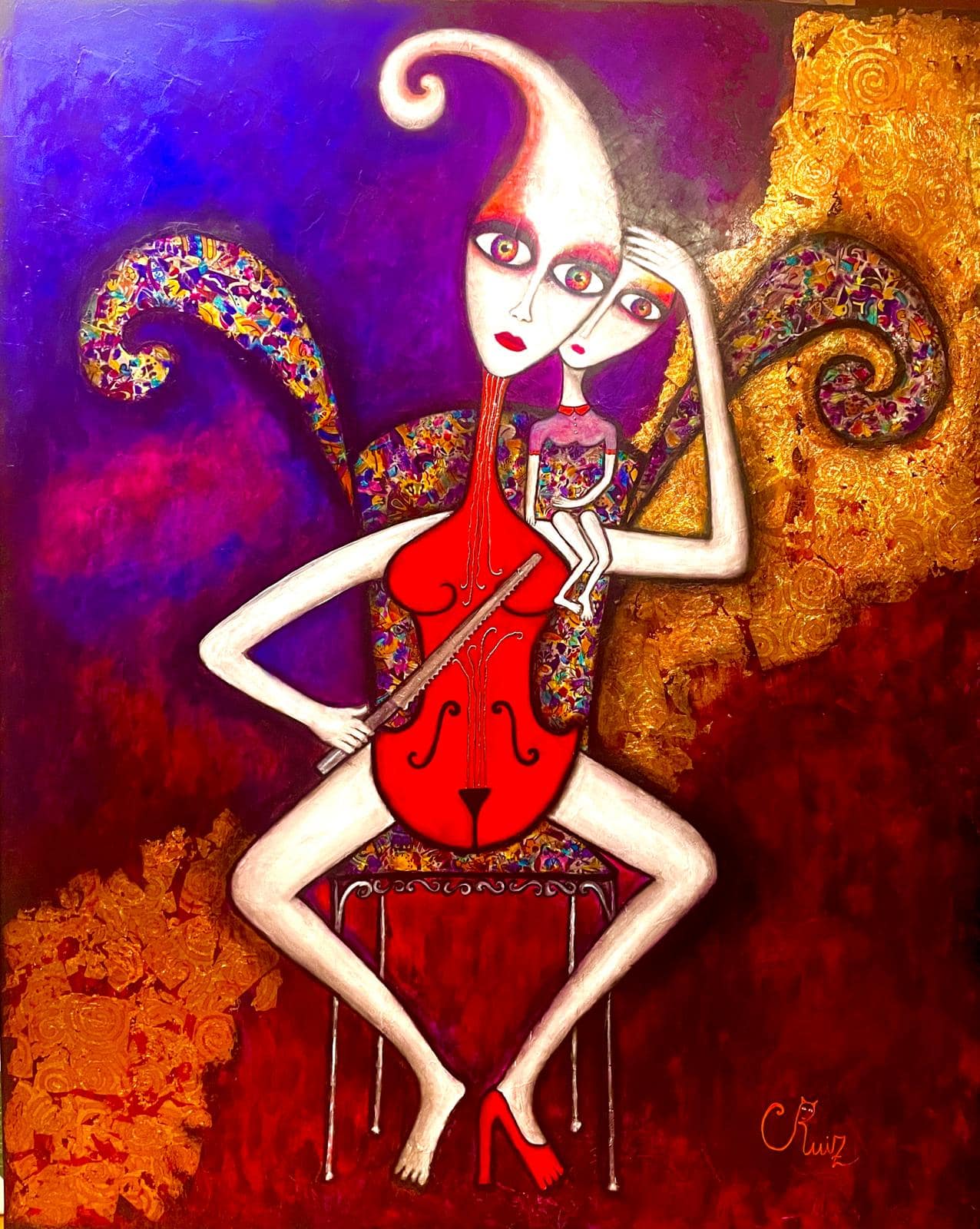 Carmen Ruiz détourne le violoncelle en un symbole de féminité entravée, ou l'instrument devient le corps même de la femme. L'archet remplacé par un couteau évoque la violence, l'autodestruction ou le combat intérieur. Le regard fixe et troublant des personnages renforce cette tension entre douceur musicale et douleur muette. Une œuvre poignante, qui questionne les dissonances entre corps, musique et souffrance.